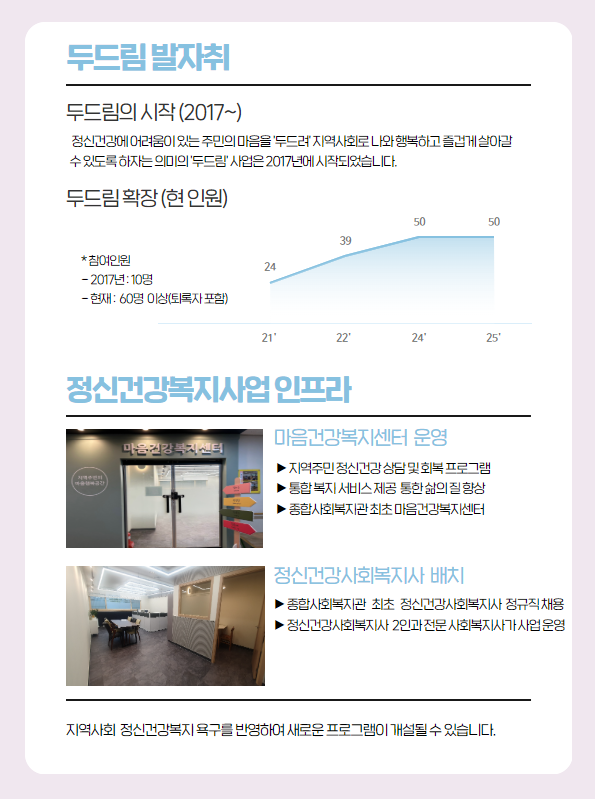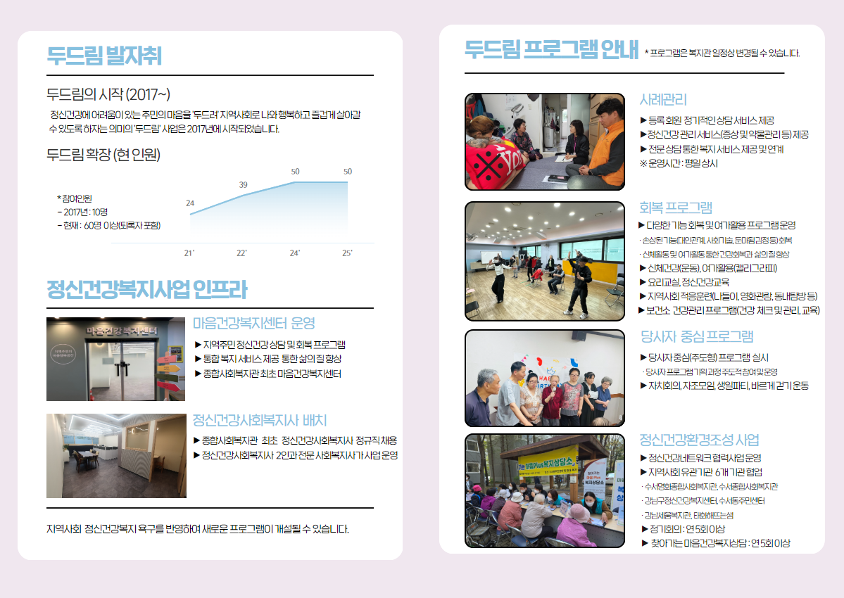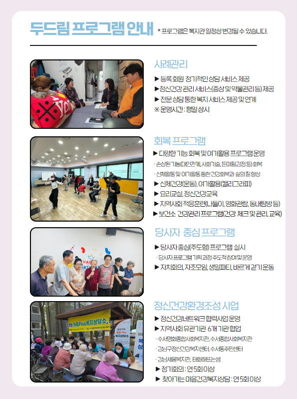 마음건강의 어려움을 가지고 살아가는 지역주민에게 상담 및 회복 프로그램과 통합 복지 서비스를 제공하여 삶의 질을 향상하는 목적으로 서울시 내 종합사회복지관 기반으로 선도적으로 시작된 정신건강사업입니다.